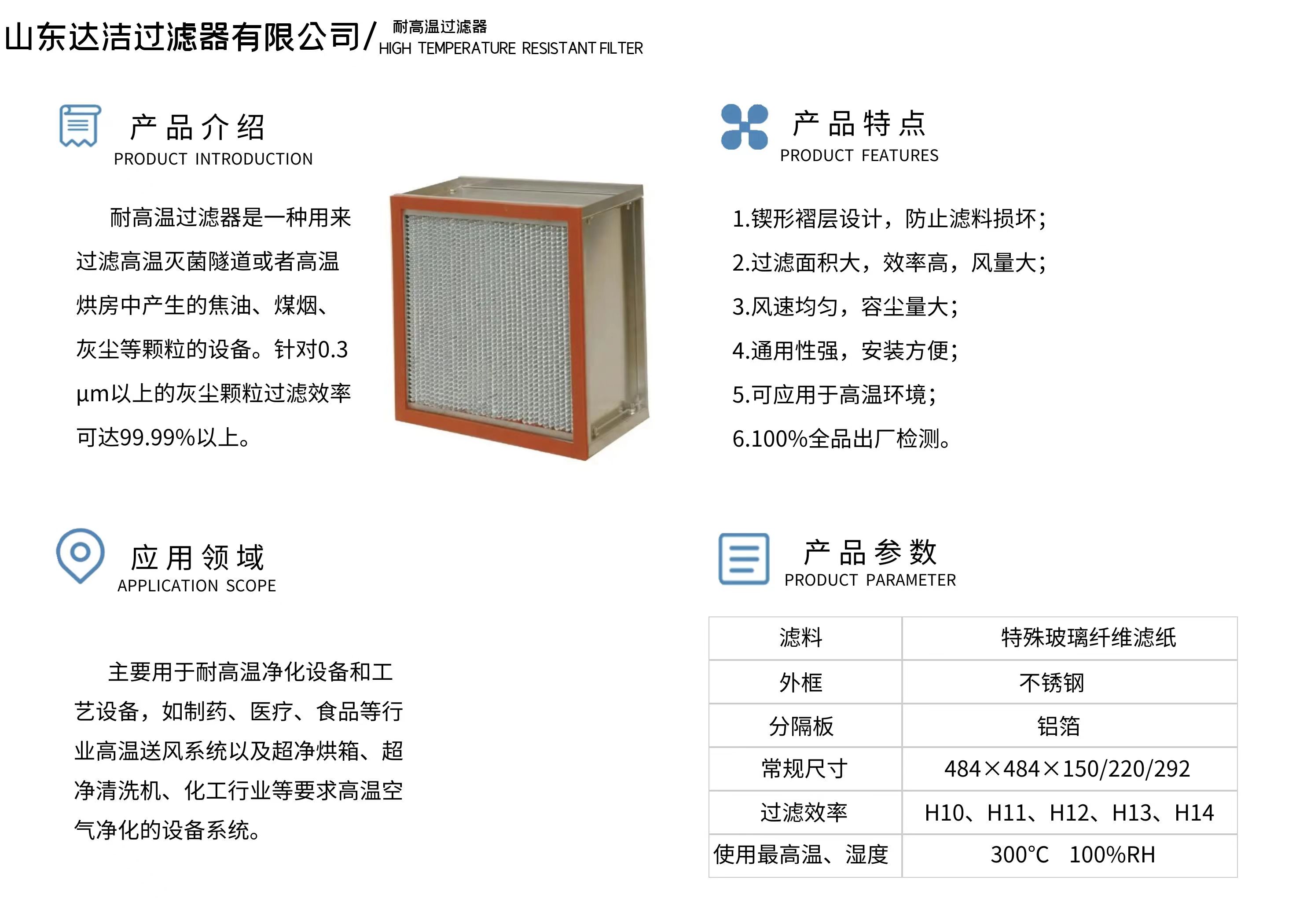 耐高溫過濾器是一種用來過濾高溫滅菌隧道或者高溫烘房中產(chǎn)生的焦油、煤煙、灰塵等顆粒的設(shè)備。針對0.3um以上的灰塵顆粒過濾效率可達(dá) 99.99%以上